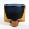 Spośród projektów Zbigniewa Horbowego reprezentowanych w naszej kolekcji polskiego powojennego szkła artystycznego przyjrzyjmy się dziś czterem wazonom, wykonanym w 1965 r. w hucie „Sudety” w Szczytnej Śląskiej. Także i one były wynikiem twórczych eksperymentów, prowadzonych na początku lat 60.: „Wtedy robiłem sześciany, prostopadłościany, które następnie szlifowałem i matowałem w kwasie. To był etap w mojej twórczości, gdyż podobne rzeczy robiono w Italii i Szwecji jeszcze przed wojną, ale polskie szkło zaczęło się po wojnie i często dziś odkrywamy Amerykę”. Kubistyczne naczynia zrobiono ręcznie ze szkła sodowego; mają sfazowane krawędzie i zmatowane powierzchnie. Składają się z wewnętrznej bańki zabarwionej na kolor kobaltowy, wpuszczonej w masywny kształt z półprzejrzystego szkła barwionego na żółto. Realizacje tego typu, w kilku wariantach kolorystycznych, na rynek trafiły w 1965 r.