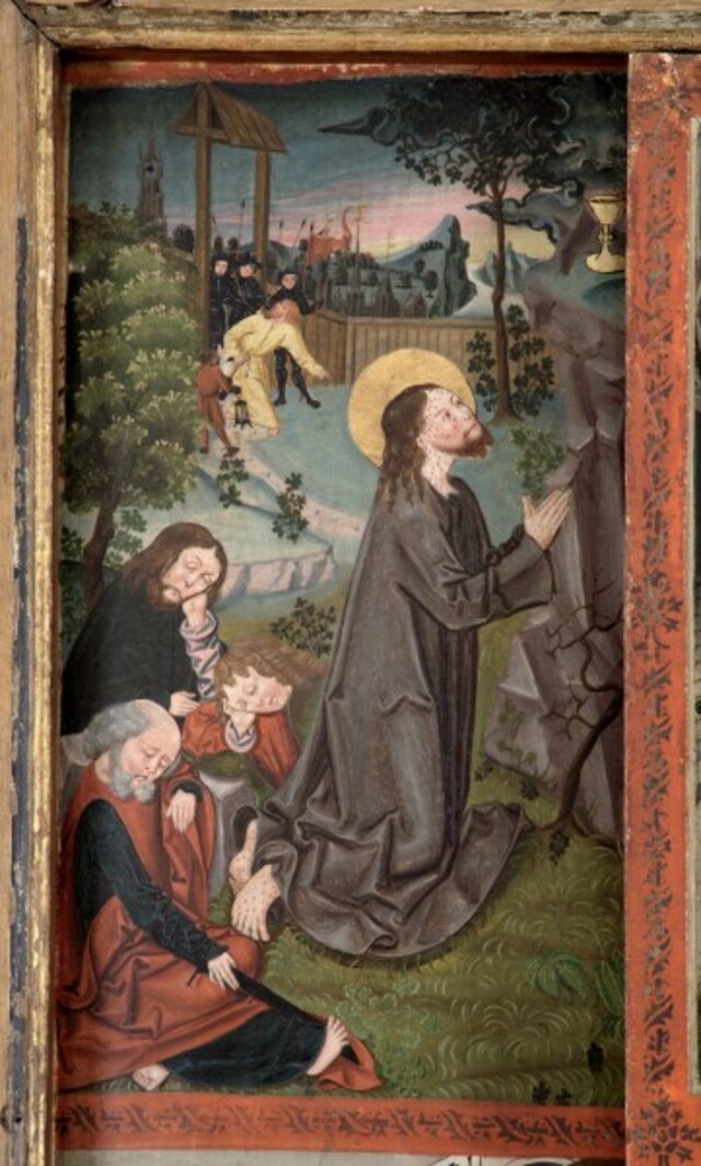 Modlitwa w Ogrójcu była popularnym tematem, chętnie podejmowanym przez artystów już w epoce średniowiecza. Najczęściej stanowiła jedną ze scen w cyklach pasyjnych. W zbiorach Muzeum Warmii i Mazur w Olsztynie znajduje się pentaptyk, na co dzień eksponowany w Zamku Biskupim w Lidzbarku Warmińskim, zawierający obraz będący dobrym przykładem typowego przedstawienia tego tematu w wiekach średnich. Ołtarz powstał prawdopodobnie w latach 1510-1520. Pierwotnie znajdował się w kościele pw. Św. Ducha w Bartoszycach. W centrum znajduje się kwatera z rzeźbioną grupą Ukrzyżowania. Skrzydła boczne prezentują sceny pasyjne oraz wydarzenia z życia świętych: Katarzyny, Agaty, Urszuli i Bernarda z Clerveux. W górnej partii lewego zewnętrznego skrzydła ołtarza artysta ukazał Modlitwę w Ogrodzie Oliwnym. W centrum sceny widoczny jest Jezus klęczący przy skale, na której stoi kielich. Nawiązuje on dosłownie do słów Chrystusa przytaczanych przez ewangelistów: „Ojcze mój, jeśli to możliwe, niech Mnie ominie ten kielich!” (Mt 26,36-46). W wielu przedstawieniach kielich trzymany jest przez anioła, który ukazał się Jezusowi. Uwagę zwracają czerwone plamy na ciele Chrystusa. Autor obrazu inspirował się Ewangelią Św. Łukasza, opisującą wyglądający jak krople krwi pot udręczonego Chrystusa. Z lewej strony widoczni są śpiący apostołowie, ukazani w typowych dla ikonografii tematu pozach, z głowami opartymi na dłoniach. W dolnej partii kwatery siedzi św. Piotr, ujmujący w dłoni miecz. Nawiązuje on do późniejszego wydarzenia, które miało miejsce już podczas pojmania Jezusa. Św. Piotr zgodnie z przekazem Ewangelii św. Jana odciął mieczem prawe ucho Malchosa – sługi arcykapłana. Powyżej widoczni są św. Jan Ewangelista oraz św. Jakub. Na drugim planie widoczny jest Judasz oraz trzech żołnierzy wchodzących przez bramę na teren ogrodu Getsemani. Typowo dla średniowiecznej ikonografii przedstawień tej postaci Judasz został ukazany jako mężczyzna o rudych włosach i brodzie, odziany w żółtą szatę. Oba aspekty jego wyglądu symbolizowały wówczas zdradę. Dodatkowo prawdopodobnie trzyma on w dłoni sakiewkę z pieniędzmi, które otrzymał za wydanie Jezusa.