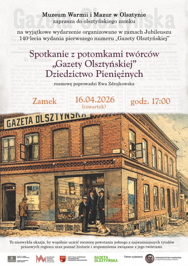 Muzeum Warmii i Mazur w Olsztynie zaprasza do olsztyńskiego zamku na wyjątkowe wydarzenie organizowane w ramach jubileuszu 140-lecia wydania pierwszego numeru "Gazety Olsztyńskiej". Spotkanie z potomkami twórców "Gazety Olsztyńskiej". Dziedzictwo Pieniężnych. Rozmowę poprowadzi Ewa Zdrojkowska. To niezwykła okazja, by wspólnie uczcić rocznicę powstania jednego z najważniejszych tytułów prasowych regionu oraz poznać historie i wspomnienia związane z jego twórcami.